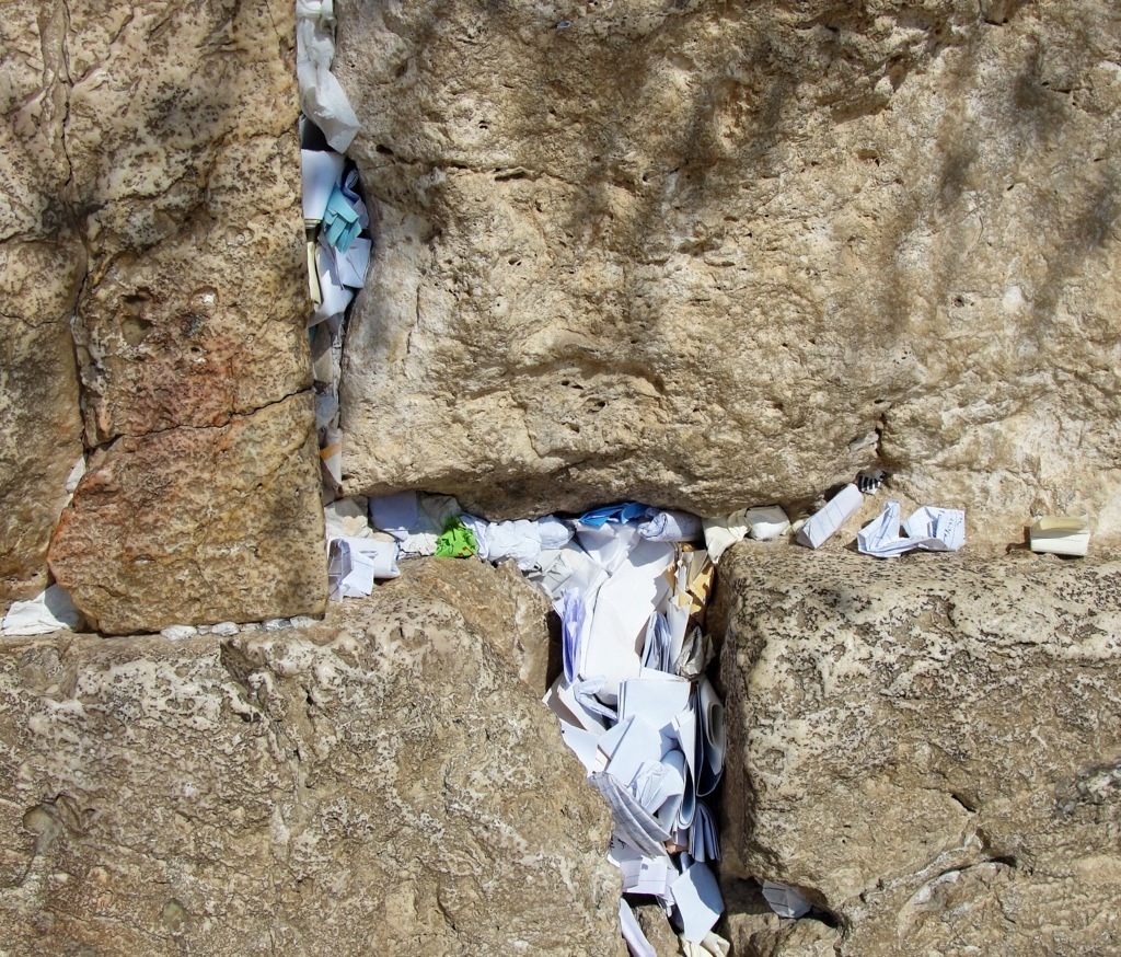 The spaces between the stones of the wall are all filled with hand written notes or prayers. Some people believe that these petitions have a greater chance of being fulfilled.