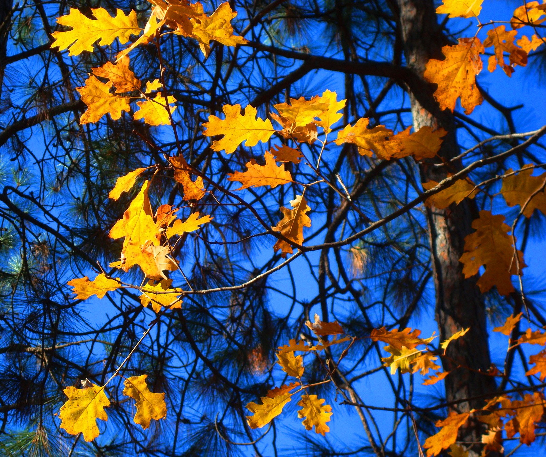 In this picture I love the vibrant yellow and gold of the leaves against the background of the evergreen tree and the beautiful blue sky. A beautiful late fall day. A beautiful sight to take in while recovering from a wonderful Thanksgiving Day meal in Groveland, California.