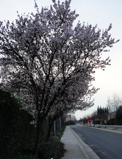 The trees are in full blossom and they stand out even though it is starting to get dark. It also reminds me of a drive that I took last Sunday afternoon where I could look out over acres and acres of blossoming orchards. Unfortunately, I was in a hurry and didn’t want to take pictures while driving at highway speed :-).