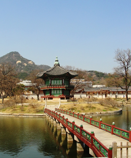In the back part of the palace complex is a square pond named Hyangwonji. In the middle of the pond is an island with a pavilion named Hyangwonjeong. I have only seen this pavilion in the winter and early spring, but have seen pictures of it in other times of the year. I need to come back when it is surrounded by more color.