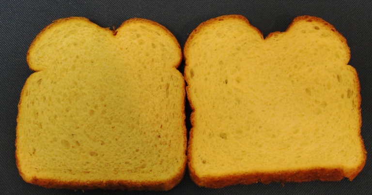 The picture does not show the color as well as I would like it to, but you can see that there is not much difference in the color of the two slices of bread. Of course, the Wheat is on the left and the White is on the right. If my memory serves me correctly, Home Pride Wheat is somewhere between these in color.