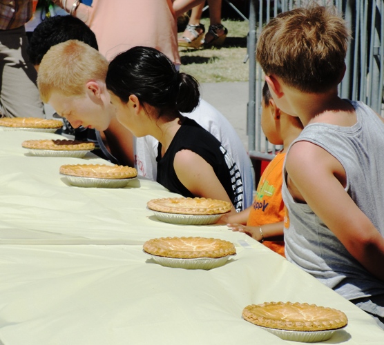 The pie eating contest! Which of the kids could eat the most apricot pie in 90 seconds. This is an interesting moment before the signal came to start eating. The boy who is staring intently down into his pie was the eventual winner and became a three time champion. It looks as though the other contestants were all watching him to get tips on how they should attack their pies.