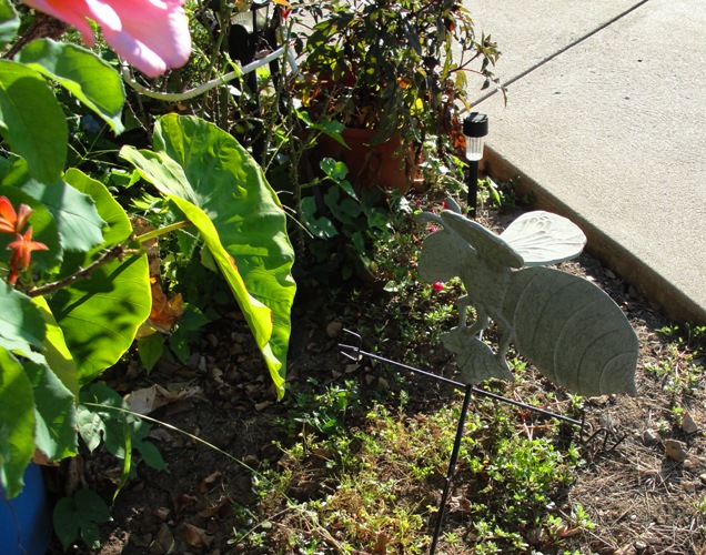 OK, I will get to the morning glory blossoms, but first we have a nice big metal bumblebee in my Dad’s flower garden. Maybe it is what attracts the little ones 🙂