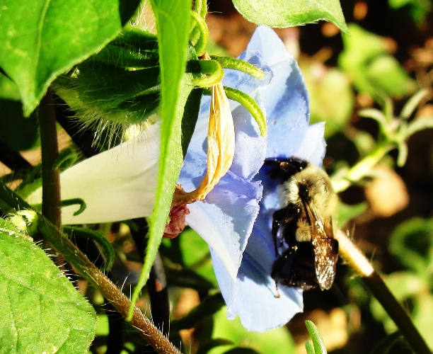 Here we have a little bumblebee collecting nectar and pollen from a morning glory blossom. There are over 1,000 species of flowers known as morning glories. They are in the family Convolvulacaea, but are spread across different tribes or genera. This one is most likely in the Ipomoea tribe.
