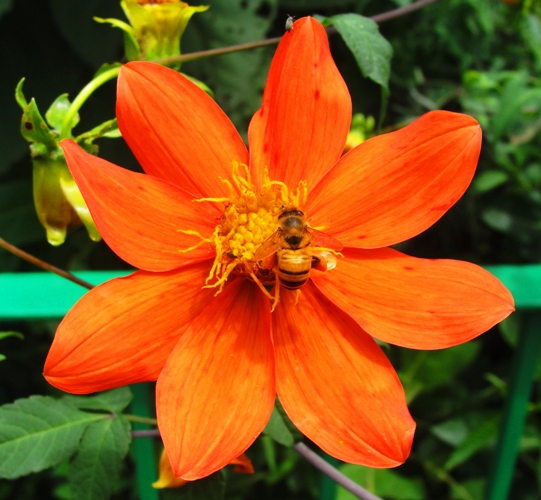 You have to look closely to find the bee in this picture. It is at the bottom edge of the bloom. However, I couldn’t force myself to crop off the surrounding seed pods in this picture just to show off the bee.