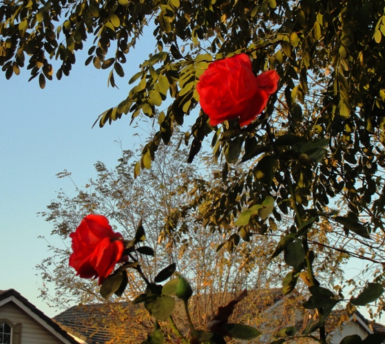 I really like these two Tropicana blooms. They are about seven to eight feet up in the air. My rose bushes are really tall this time of year.