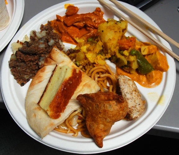I really like Indian food, especially Butter Chicken. You can also see Shepherds Pie from England and some cornbread from America on the plate. There are also some Chinese noodles underneath everything.
