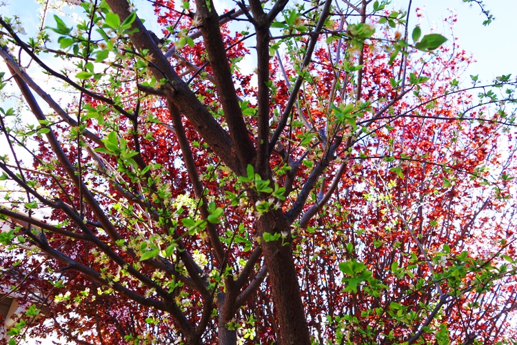 Today the blossoms were mostly gone and my tree is starting to fill in with green leaves and the neighbors with dark red leaves. I like this colorful pictures.
