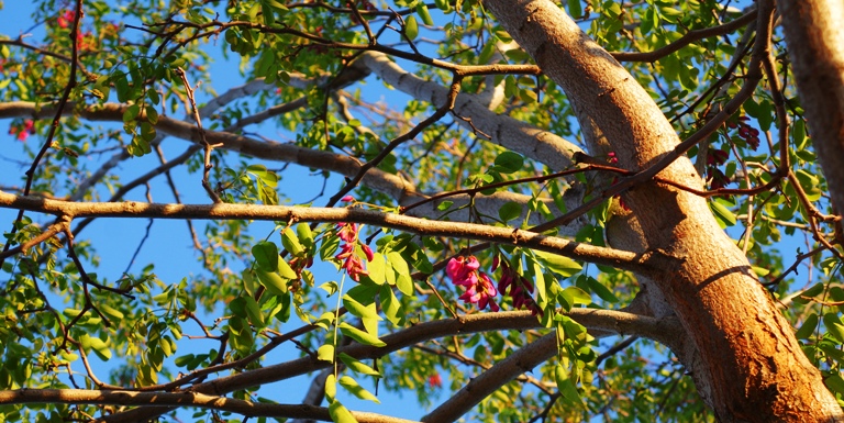 Here is a picture I took on Monday of the Purple Robe Locust tree in my front yard. The tree is also know as Robinia ambigua or Idaho Locust. The tree is just beginning to bloom.