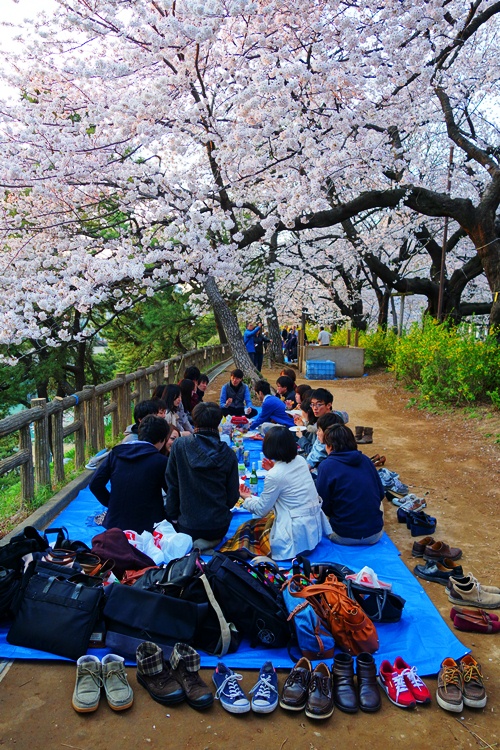 As we were walking back to the hotel we say many groups of people laying out tarps. Here a group has laid out their tarps and are having a nice feast while enjoying the cherry blossoms. I really like this picture as it shows all the shoes lined up along the edge of the tarp.