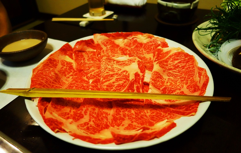 The meat is dropped into the hot pot and swished back and forth a few times and is then placed in goma or sesames seed sauce.