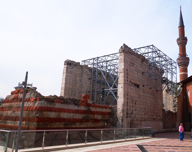 Temple of Augustus - Monumentum Ancyranum - Ancyra Temple of Augustas - Roman ruinsWe then walked to the Temple of Augustus and Rome. This is also known as Monumentum Ancyranum. The taller portion of the temple was built about 20-25 BC after the Romans conquered Anatolia. The shorter portion was built earlier and was for the worship of a goddess. The structure was later used as a church and now the adjacent area is a mosque.