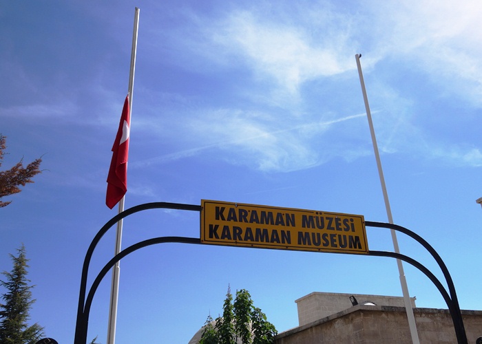Karaman Museum - Derbe Inscription - Flag at Half-Staff - Turkish Mining disasterThe picture here is posted for two reasons. One, it is to show that we visited the Karaman Museum. In the courtyard of the museum is a stone that has the name Derbe on it. The stone helped to identify that Kertihoyuk was Derbe.