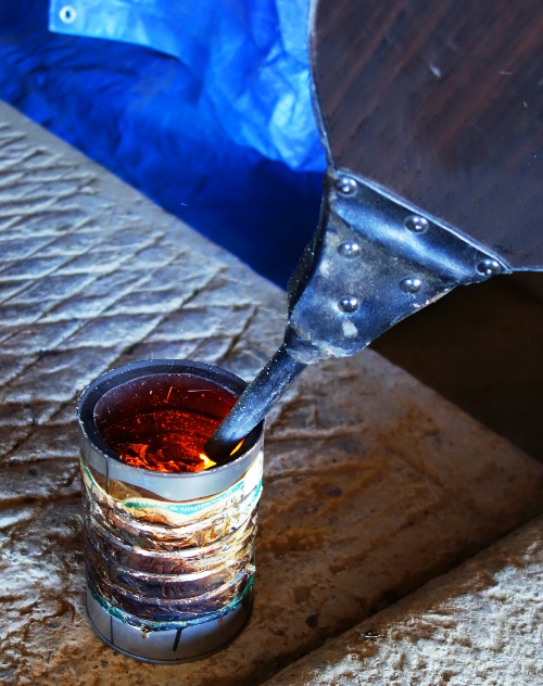 A pair of bellows is used to help start the sulfur on fire. Once the sulfur powder starts to burn it has a blue flame. This reminds me of high school Chemistry lab experiments.