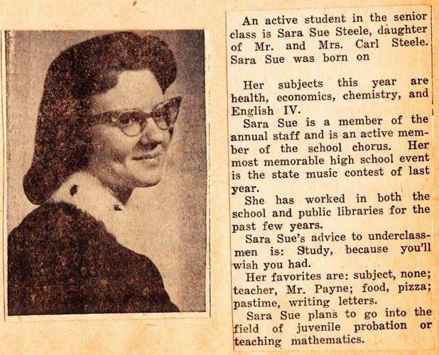 Here is the Senior profile for Sara Sue Steele who was in my Dad’s class in High School. I have always enjoyed reading the Senior profiles in my Grandma’s scrapbooks.