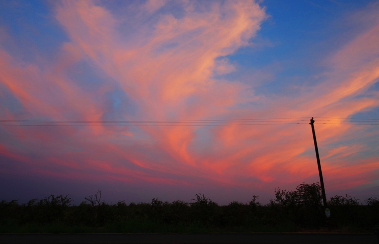 Here we have clouds that are lit up by the setting sun. This is looking south, so the sun is coming from the side and providing vivid colors to the clouds. Again, I like the silhouettes in this picture. The telephone pole and telephone lines make for an interesting contrast.