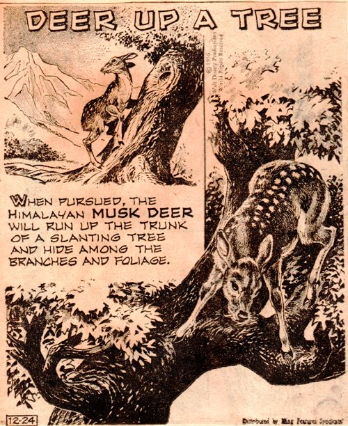 When pursued, the Himalayan Musk Deer will run up the trunk of a slanting tree and hide among the branches and foliage.