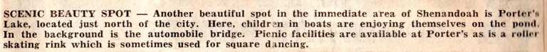 I am sure that many people from the Shenandoah area remember fun times at Porter’s Lake. I will have to ask my Dad if he ever spent time there.