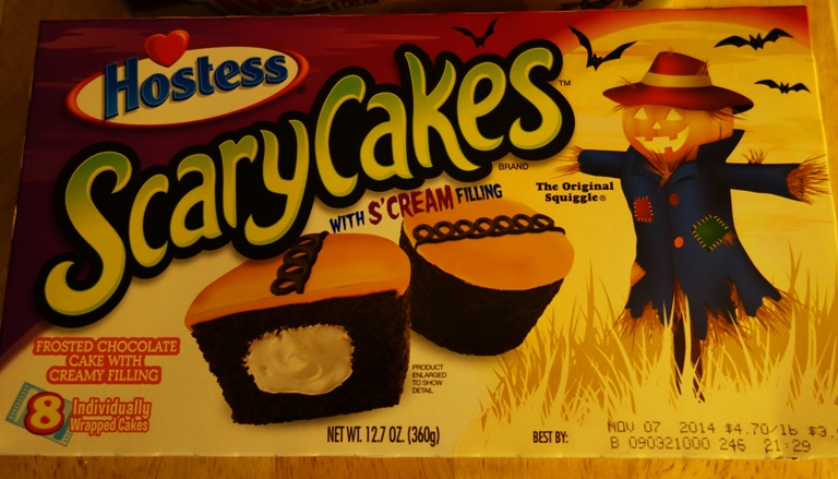 While shopping at Wal-Mart I saw Hostess Scary Cakes which are basically Hostess Cup Cakes with Orange frosting instead of the traditional chocolate.