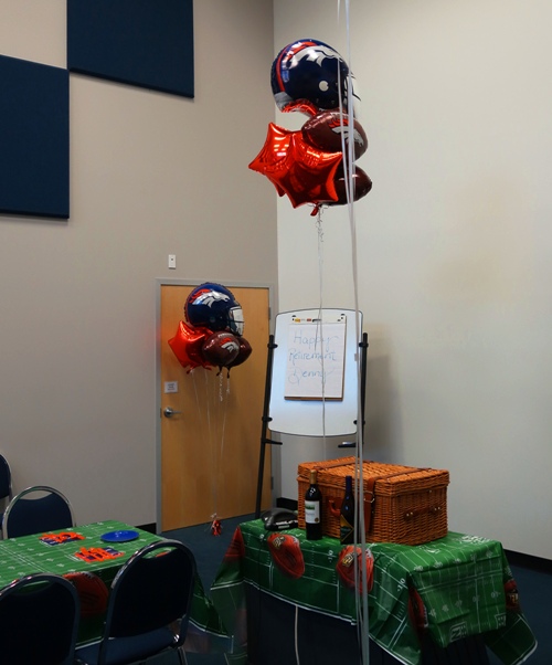 Denny is a big Denver Broncos fan. The party decorations were all Bronco themed. We had a nice buffet lunch for our entire department.
