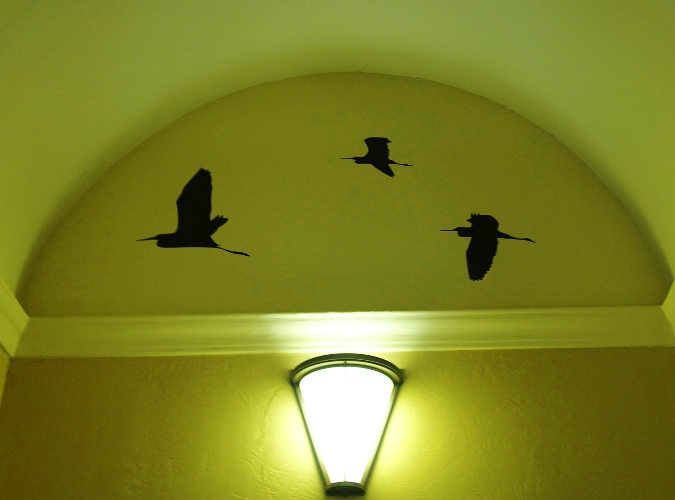 These vinyl graphics make up Birds in Transit by Anne M. Klint who is a local artist. All of the birds shown are migratory birds that transit through the San Joaquin Valley every year.