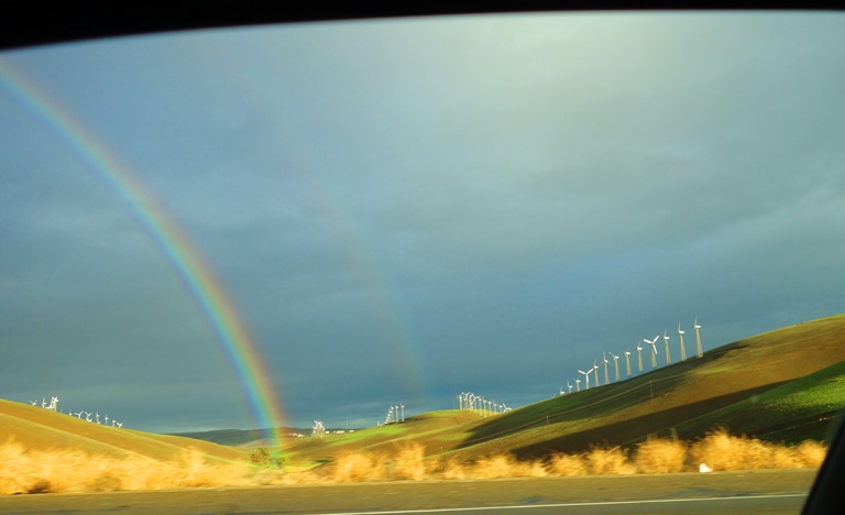 Here we see a nice double rainbow and two lines of windmills. You can also see that the sky was getting darker and it was only a few minutes before I was driving through heavy rain.