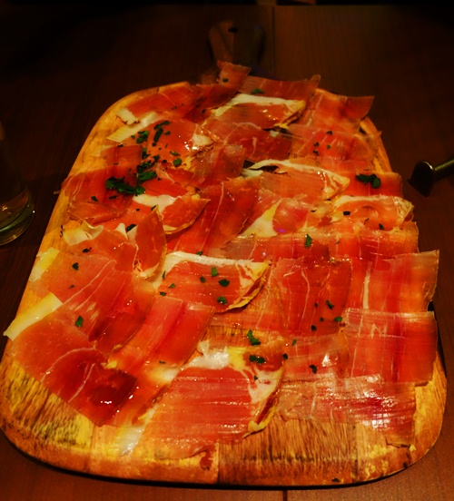 Here we have a wooden paddle full of jamón serrano. Actually, I am not sure if it is jamón serrano, it may be jamón iberico. In any case, it is a dry-cured ham from Spain that is thinly sliced and then cooked in an oven.