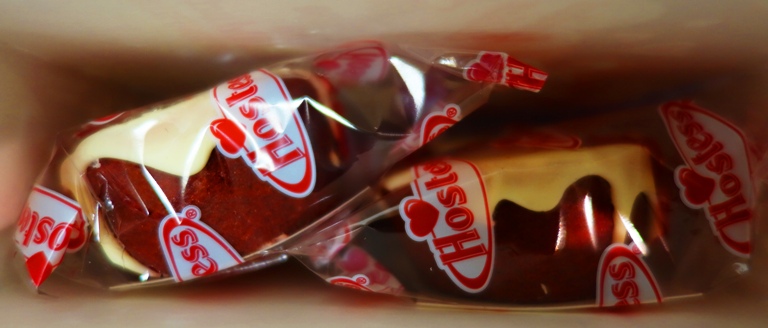 I unwrapped one of the cakes and found that it had a nice red “original squiggle” on top of a white icing. They definitely are pretty enough for a Valentine’s Day treat.