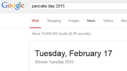 I googled pancake day 2015 and Google returned Tuesday, February 17. Shrove Tuesday 2015.