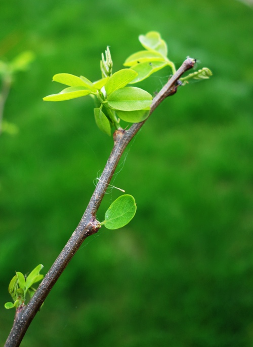 Here are some more leaves on the tree. There are also some small fibers that have been snagged by the branch that make for an interesting contrast. I also like the very green grass in the background.