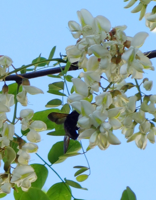 The pictures were taken of my Black Locust or Robinia pseudoacacia tree that grows in my backyard. If you look closely in this picture you can see a bee in the center.