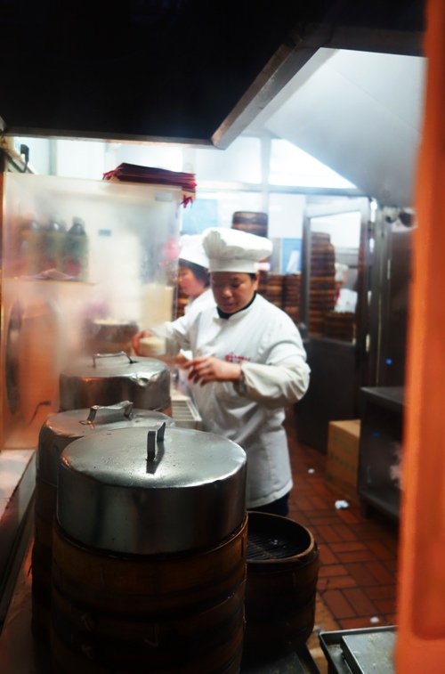 We were lucky that the line was not too long. I figured we would only have about a 15 minute wait. Here is a peek through the window into the kitchen where we see dumplings cooking over the steamers.