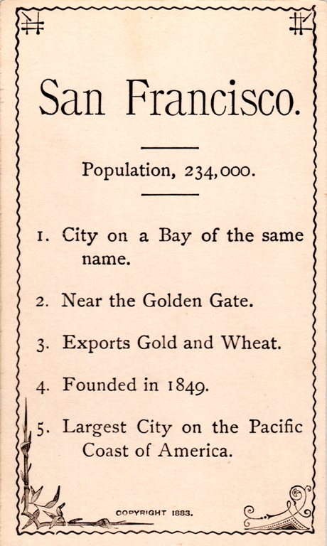 This one is close to home. It is interesting to see how San Francisco is described in 1883. At that time it was the Largest City on the Pacific Coast in America. It is also interesting that it exported Wheat. I challenge anyone to find a wheat field in San Francisco today.