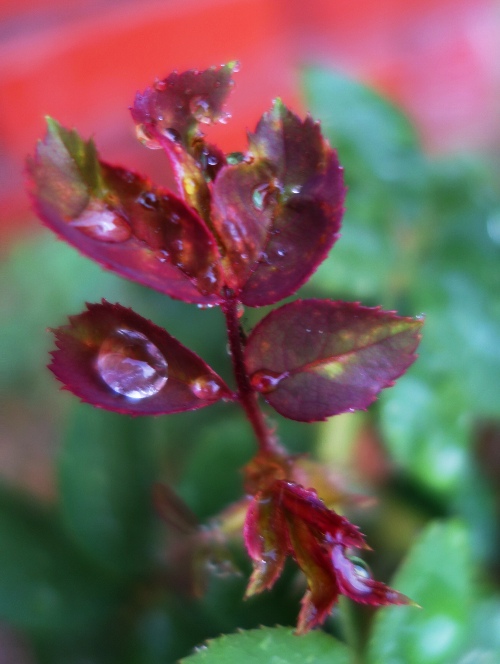 Water Droplets, Mister Lincoln Rose, Roses, Bush, Rose GardenOne more picture of the droplets of water on the leaves. I really like this picture as it has some nice water drops, but also the leaves are starting to turn from red to green. Soon the leaves will be green just like the earlier ones.