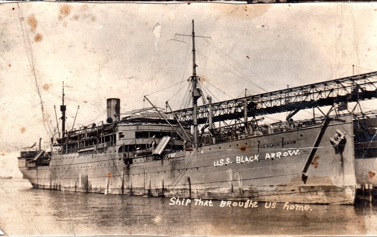 This post card has a picture of the USS Black Arrow. Someone wrote on the front of the card USS Black Arrow in larger letters and also the caption ‘Ship that brought us home.’