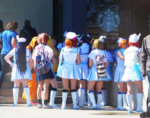 This group of young ladies outside of a Starbucks were definitely anime fans. The school girl in uniform is one of the most common images in anime.