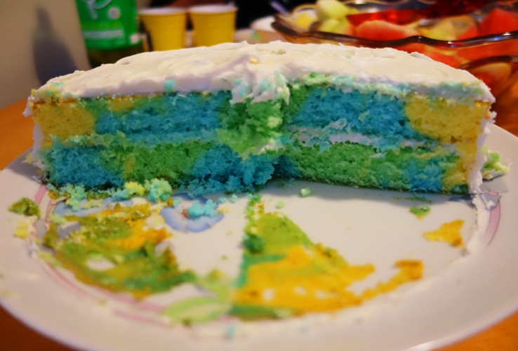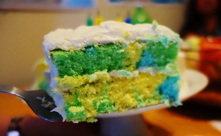Blue, Green, Yellow, Cake Colors, Colorful Cake, Birthday CakeHere is a nice side view of the first piece which ended up on my plate along with a nice scoop of vanilla ice cream. The cake was very delicious along with being very colorful.