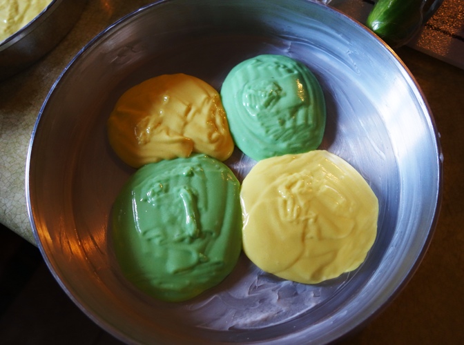 Cake Batter, Food Coloring, Colorful Cake, Birthday CakeHere are the three bowls of batter. I got to choose the colors so I chose green and blue as they are two of my favorite colors. Then I decided on yellow as it was a good complementary color.