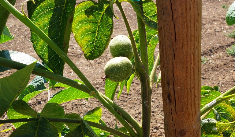 Here are a few walnuts on a young tree. The walnut tree (Juglans regia) originated in the mountains of Central Asian. In Latin the walnut was know as nux Gallica as they were grown in the Galatian region of what is today Turkey.