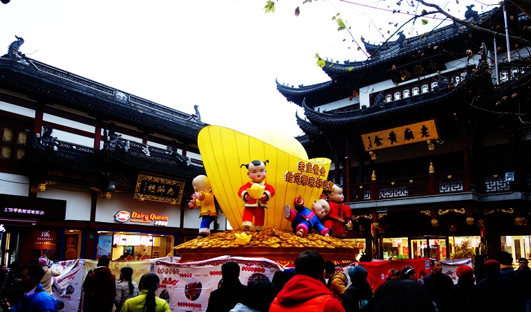 In the Yuyuan Tourist Mart there is a large display of children who are celebrating the New Year. At least this is my interpretation 🙂 The New Year is a time of good fortune and the children are playing on a pot full of gold.