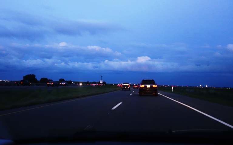 Here I am nearing the top of the Altamont. The picture is a bit deceptive as it looks like I am driving into the sunset. It is evening, but I am driving toward the East. I like to call this a backset, as the clouds opposite the sunset are lit up. You can see that the sky looks threatening, but no rain was falling.