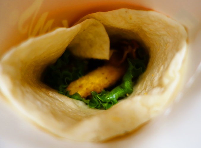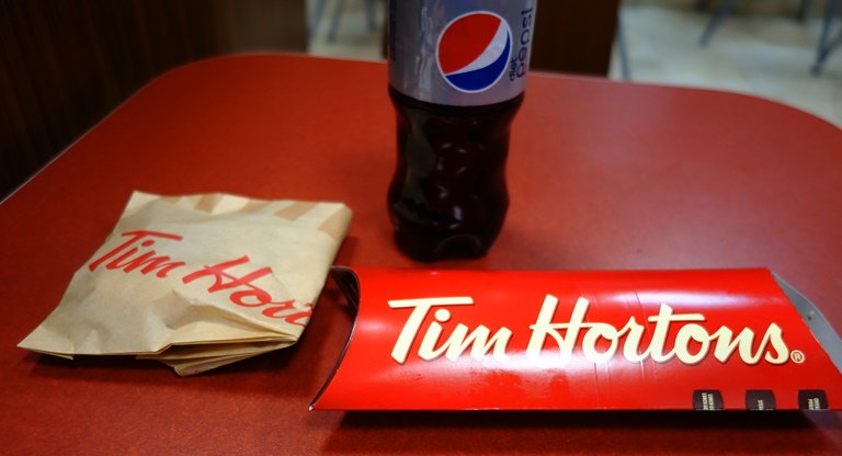 Tonight my food was a little easier to eat. I had a Chicken Bacon Ranch Wrap at Tim Hortons. The wrap was in a nice sleeve that made it easy to hold in one hand and eat.