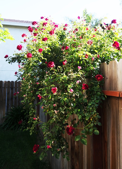The neighbor’s rose bush has spilled over the fence into my back yard and is also full of blooms. It was a welcome sight as I walked into my backyard to check on things this morning.