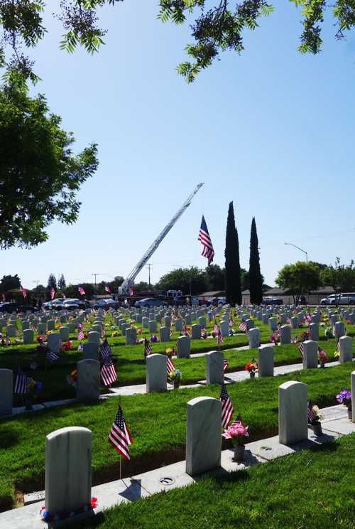 One of the first things that I saw as I got near the cemetery was a large US flag hanging from the hook and ladder truck. After parking my car I was able to get a nice shot of the flag from across the section of the cemetery known as Little Arlington.