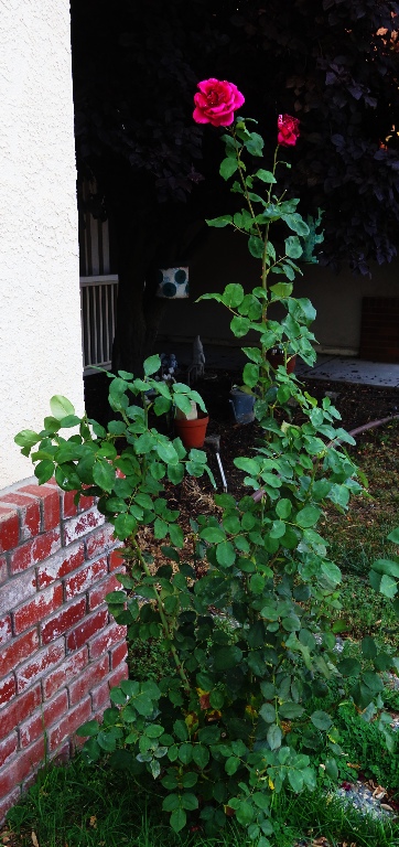 Here is my Mister Lincoln rose bush. There are only a few roses on the bush right now, but there are more buds setting on. It is only June, but the rose bush is already six feet tall.