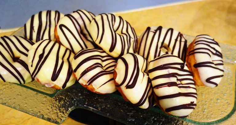 Along with the meals there are snacks during breaks from the training course. They cover a wide range from fruit, desserts, dumplings, savory bites and pastries. They are beautifully presented like these striped donuts. They make me think of zebras.
