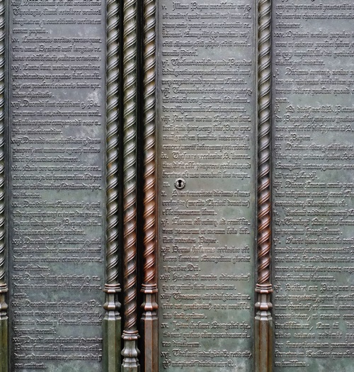 These are not the wooden doors that Martin Luther posted his theses on, but are hung in the same place. The wooden doors were burned in a fire during the Pomeranian War in 1760. The current doors were hung in 1858.