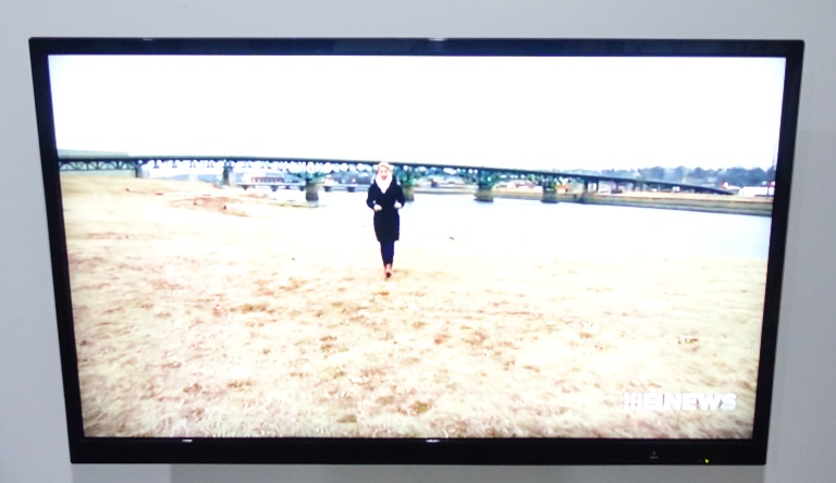They showed a nice aerial picture of Ottumwa, but I missed it. Instead I got this out of focus picture of the reporter standing in front of one of the Ottumwa bridges.