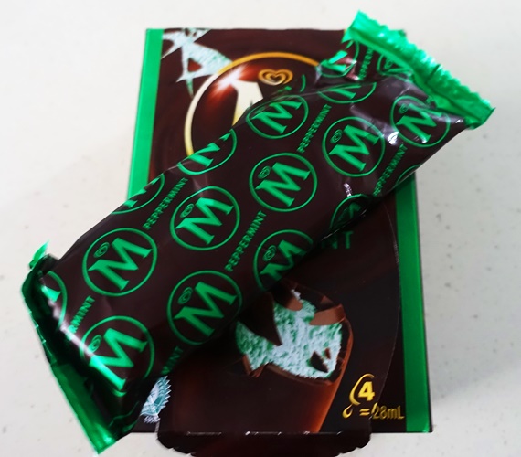 Here the magnum bar is revealed. One thing that I have noticed about the Magnum bars in Australia is that the chocolate shell is a bit fragile. This makes it a little difficult to eat as the shards easily fall off while you are eating. However, they taste delicious, so it is worth a little bother.