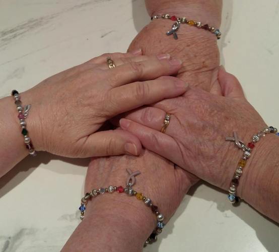 On Fridays my Mom and her sisters meet for a sister’s lunch when they are in town. In the past couple of years they have all worn special bracelets to their lunch to support Glenda. Here is a picture of them all together.